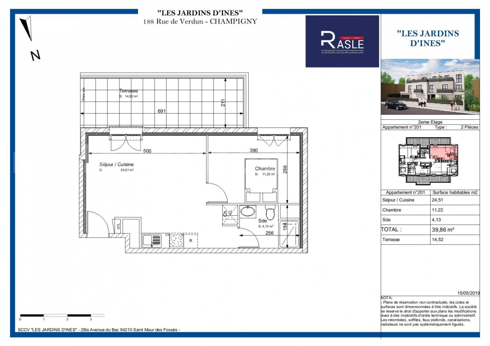 LES JARDINS D'INÈS résidence de standing situé au 188 rue de Verdun à proximité des bords de Marne dans le centre ville de Champigny-sur-Marne. Elle bénéficie d'une situation privilégiée dans un cadre paisible proche de toutes les commodités : écoles Mairie poste marché commerces structures culturelles et sportives à 10' à pieds du RER A et de la future gare métro du grand Paris. La résidence se compose de 10 logements répartis sur 2 étages avec parkings. Cet appartement de 2 pièces d'une surface habitable de 39.86 m² avec des prestations de qualités offre une belle luminosité notamment grâce à une terrasse de 14.52 m² orientée sud. Il comporte un séjour avec une cuisine ouverte une chambre une salle d?eau avec wc. Prix : 240 000 € FAI. Frais de Notaire réduits. Nombre lots copropriété : 22. Charges courantes annuelles : 996 € (estimées). Pas de procédure. Honoraires charge vendeur. LIVRAISON FIN 2020.