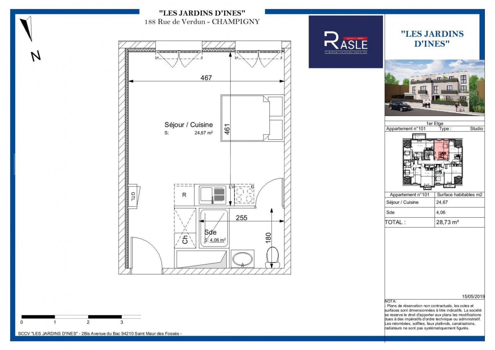 LES JARDINS D'INÈS résidence de standing situé au 188 rue de Verdun à proximité des bords de Marne dans le centre ville de Champigny-sur-Marne. Elle bénéficie d'une situation privilégiée dans un cadre paisible proche de toutes les commodités : écoles Mairie poste marché commerces structures culturelles et sportives à 10' à pieds du RER A et de la future gare métro du grand Paris. La résidence se compose de 10 logements répartis sur 2 étages avec parkings. Ce studio d'une surface habitable de 28.73 m² avec des prestations de qualités offre une belle luminosité notamment grâce à son exposition sud. Il comporte un séjour avec une cuisine ouverte une salle d?eau avec wc. Prix : 178 500 € FAI. Frais de Notaire réduits. Nombre lots copropriété : 22. Charges courantes annuelles : 707 € (estimées). Pas de procédure. Honoraires charge vendeur. LIVRAISON FIN 2020.